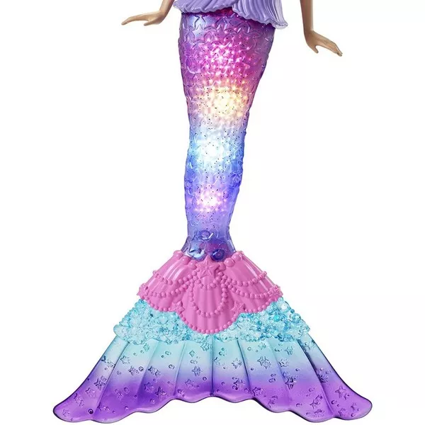 A Barbie baba felsőjén található csillag alakú gomb megnyomásával pedig automatikusan is elindítható a fény show, így víz nélkül is élvezhetik a szivárvány színű ragyogást.