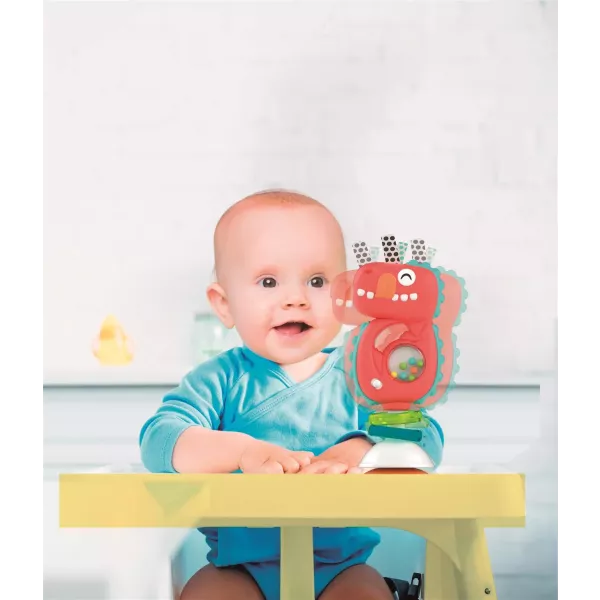 A cuki dinócska formájú csörgő, az akasztó segítségével a babakocsira vagy a kiságyra is rögzíthető, de akár az asztalra is letehető stabil talpának köszönhetően. A csörgő hang- és fényhatásokkal rendelkezik, amelyek a játék lenyomásával aktiválhatók. A csörgőn 2 darab színes, mozgatható gyűrű is található.