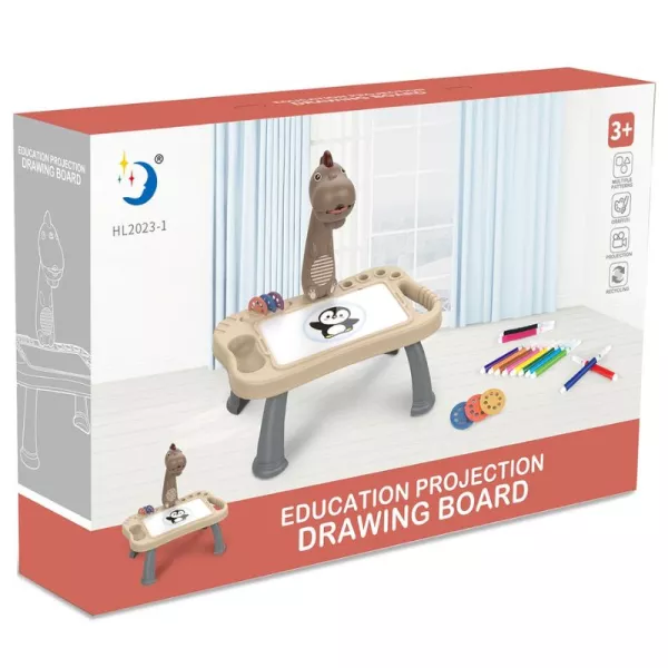 Ezzel a cuki, dinós vetítős rajzasztallal a kicsik órákat el tudnak játszani, hiszen a dinó szájába betehető korongok különböző ábrákat vetítenek az asztalra, amiket a gyerekek lemásolhatnak, és ki is színezhetnek a mellékelt filctollakkal.