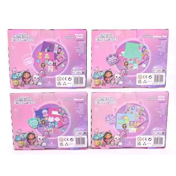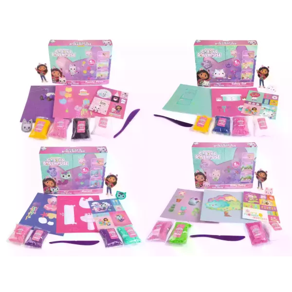 A népszerű, Netflixen futó Gabi babaháza animációs sorozat kis rajongói garantáltan imádni fogják ezt a mini gyurmaszettet, amellyel megalkothatják kedvenc karaktereik varázslatos világát. A dobozban egy cicafej (Pandi Pajti, Süti, Szirénke vagy Cicatündér), egy formázóeszköz, egy papírból készült Gabi figura, kartonpapír elemek, valamint 4 csomag könnyen formázható, puha gyurma kapott helyet, amelyek segítségével a gyerekek megalkothatják a mese szereplőit, helyszíneit, jeleneteit.