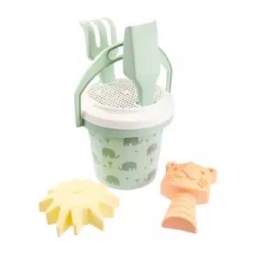Pasztell zöld színű, mintás homokozó szett, amely egyaránt használható a kertben, a strandon vagy a tengerparton. Vastag, strapabíró műanyagból készült.