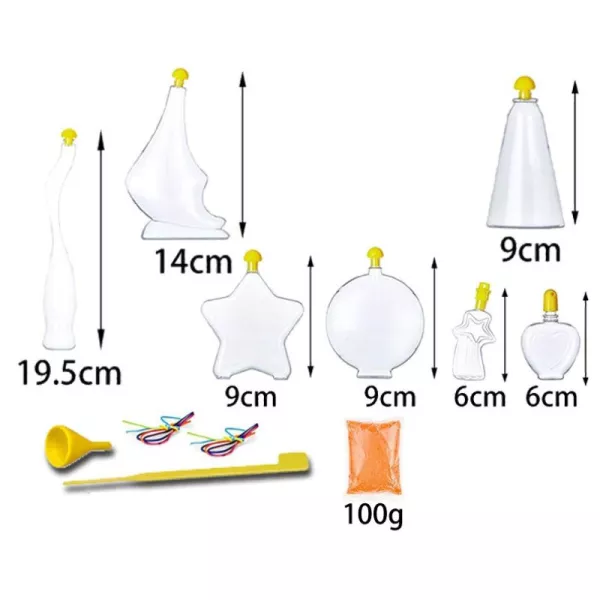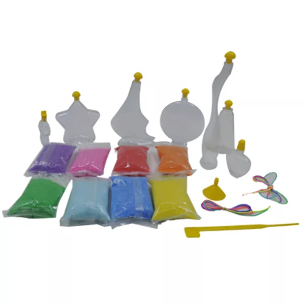 Tartalom: 7 db műanyag, különleges formájú palack, 8 csomag színes homok, 1 db tölcsér, 1 db kis pálca, 2 db zsinór.