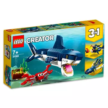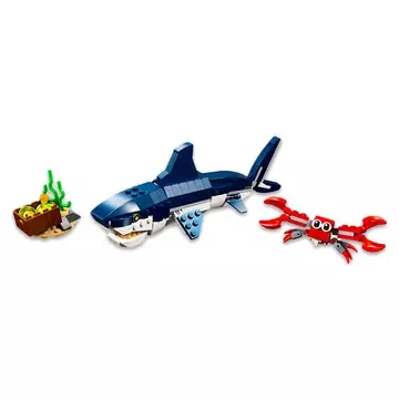 Élvezd a tengeri élet kalandjait a LEGO Creator 3 az 1-ben 31088 Mélytengeri lények szettel, melyben egy félelmetes játék cápát találsz valósághű, sötétkék és fehér színekben pompázva, emellett hegyes fogakkal teli, nyitható szája, mozgó uszonyai, mozgatható test ízületei és visszatükröződő szeme van. Ezenkívül pedig egy beállítható rák is vár rád kincsesládával. A LEGO Creator 3 az 1-ben játékkészletekkel 3 különböző építési és játékélményben lesz részed. Építsd meg a játék Cápát és rákot, majd alakítsd át őket állítható Tintahallá, vagy egy széles szájú Ördöghallá, hogy még több mélytengeri mókában legyen részed!