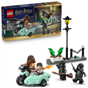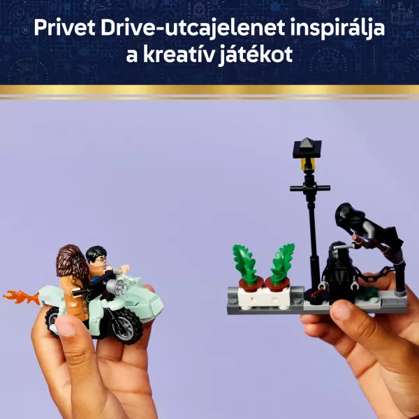Helyezd Rubeus Hagrid minifiguráját a motorkerékpárra és Harry Pottert az oldalkocsiba! Illeszd a 2 halálfaló-minifigurát a Privet Drive-jelenetre, ahol egy lámpaoszlop és több virágcserép található! A cserepek felborulnak a hősök vakmerő menekülése során.