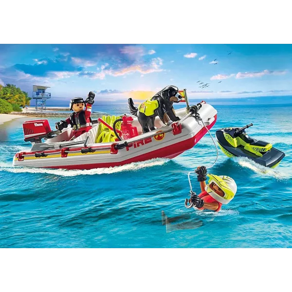 A Playmobil 52 elemet tartalmazó játékszettjével a gyerekek eljátszhatják a vízi mentőakciók adrenalindús jeleneteit. A készletben egy részletgazdagon kidolgozott, motorral felszerelt tűzoltócsónak, egy jet ski, egy poroltó, valamint a merüléshez szükséges kellékek (pl. búváruszony, búvárszemüveg, pipa) is megtalálhatók.