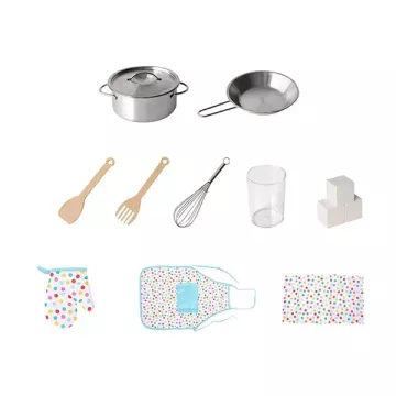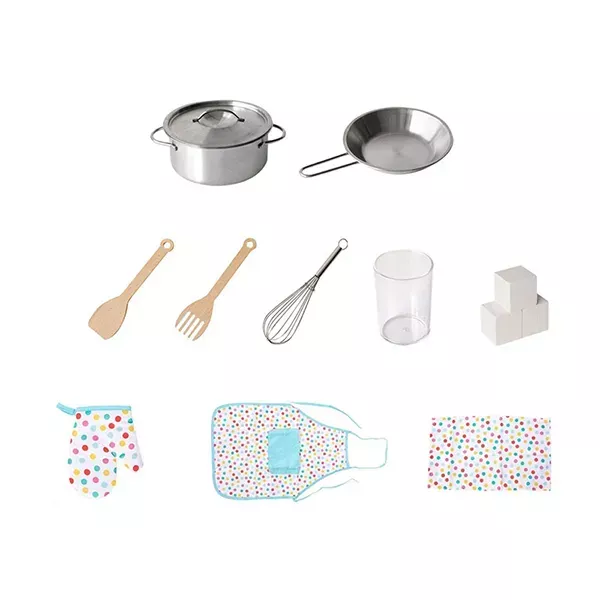 • Tartalmaz edényeket és kiegészítőket: lábos, serpenyő, habverő, fakanalak