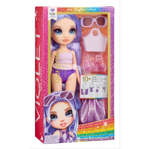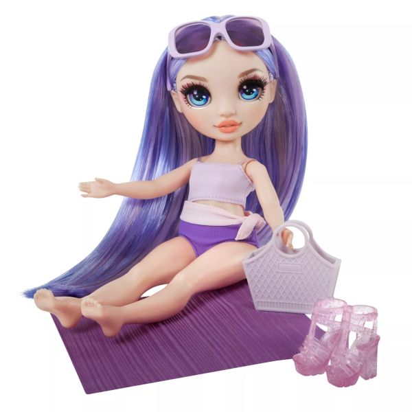 A Rainbow High babák most a strandra készülnek, és mint mindenhova, oda is divatosan mennek, hogy ők legyenek a legmenőbbek. A csomagban számos kiegészítő található, mint például, fürdőruha, táska, napszemüveg és egy pléd, ami ruhadarabként, de törölközőként vagy pokrócként is remekül megállja helyét.