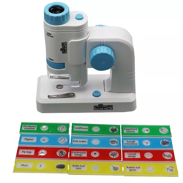 Ezzel a mikroszkóppal a kis tudósok betekinthetnek a világ apró részleteibe. Könnyen kezelhető, és kiválóan alkalmas oktatási célokra. A csomagolás előre elkészített mintákat is tartalmaz, így rögtön kezdődhet a felfedezés. Többféle mértékben képes nagyítani.