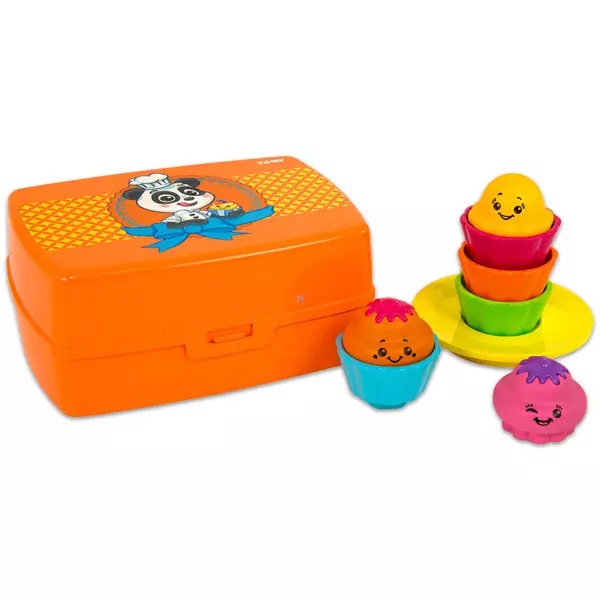 A Tomy Muffin válogató bébijátékkal a gyerekek kedvükre pakolgathatják a mosolygós sütiket a különböző színű muffintartókba, majd a kész sütiket a tároló dobozba.