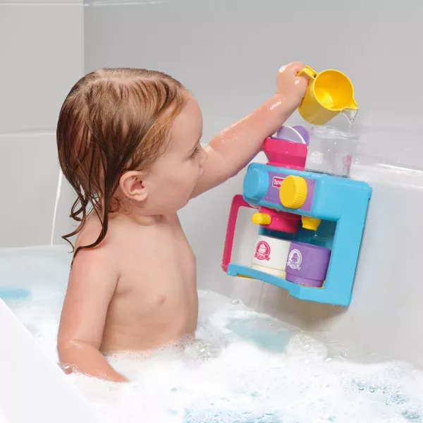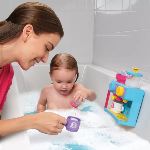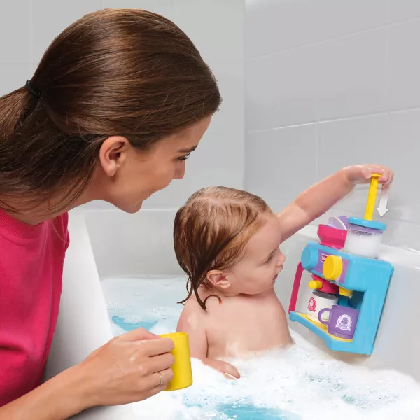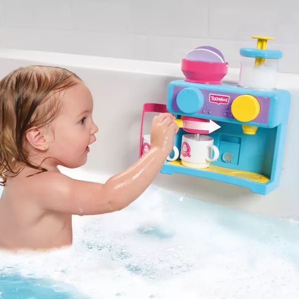 Megnyílt a habkávézó! Felejtsd el a tortúrát, a Tomy Toomies fürdőjátékával a kicsik saját kávézót nyithatnak, méghozzá a fürdőkádban! Ez a kiváló minőségű játékszett tartalmaz egy kávéfőzőt, bögréket, cukortartót és egy mosolygós tejes kancsót. A gyerekek megtölthetik a kávéfőző részeit fürdővízzel, majd a gombok elcsavarásával vagy felhúzásával és lenyomásával már „le is főhet” az ínycsiklandozó Bubiccino, Tajték Latte vagy a fürdővízből készült presszó!