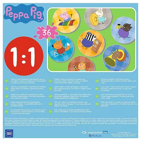 A Peppa malac memória játékkal a kicsik is frissen tarthatják emlékezőképességüket! Ki kell tenni a kártyákat egymás mellé, alaposan tanulmányozni a kártyák elhelyezkedését, majd lefordítani, és kettesével felfordítani őket. A szett 36 db memóriakártyát tartalmaz. A játékidő kb. 25 perc.