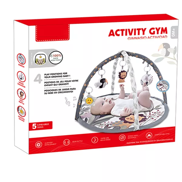 Tartalom: 1 db játszószőnyeg, 5 db felakasztható játékkal (tükör, puha csörgő, állatka zizegő hangú töltettel, zenélő virág, sima állatfigura).