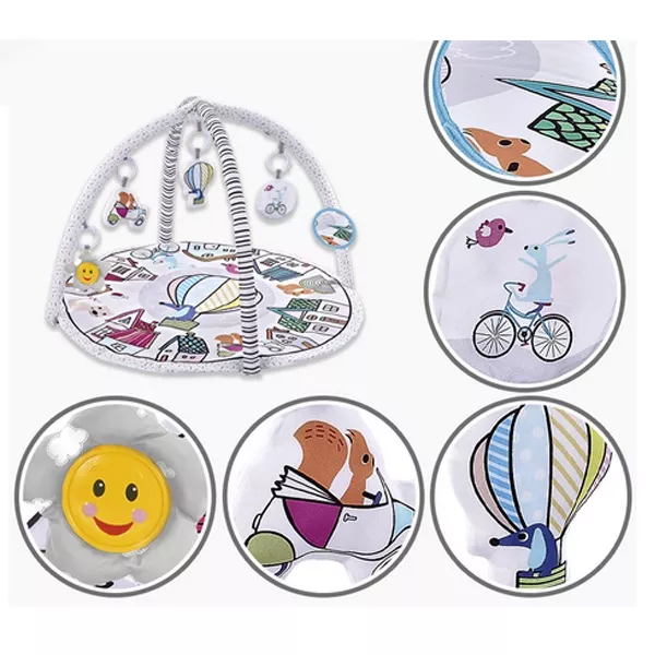 A kicsik imádnak hemperegni és játszani a játszószőnyegeken, hiszen akármerre fordulnak, mindig éri őket valamilyen játékos inger. Ezen az igényes, aranyosan kidolgozott játszószőnyegen a hátukon fekve rugdoshatják a lelógó függőket, a kicsit nagyobbak pedig meg is ragadhatják a játékhídról lelógó figurákat és tükröt (nem igazi).